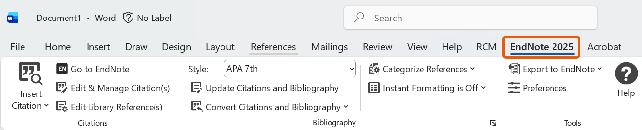 EndNote 2025 'Cite While You Write (CWYW)' tab integrates all EndNote features into a Word document. This add-in appears on the Word toolbar after installing EndNote Desktop.