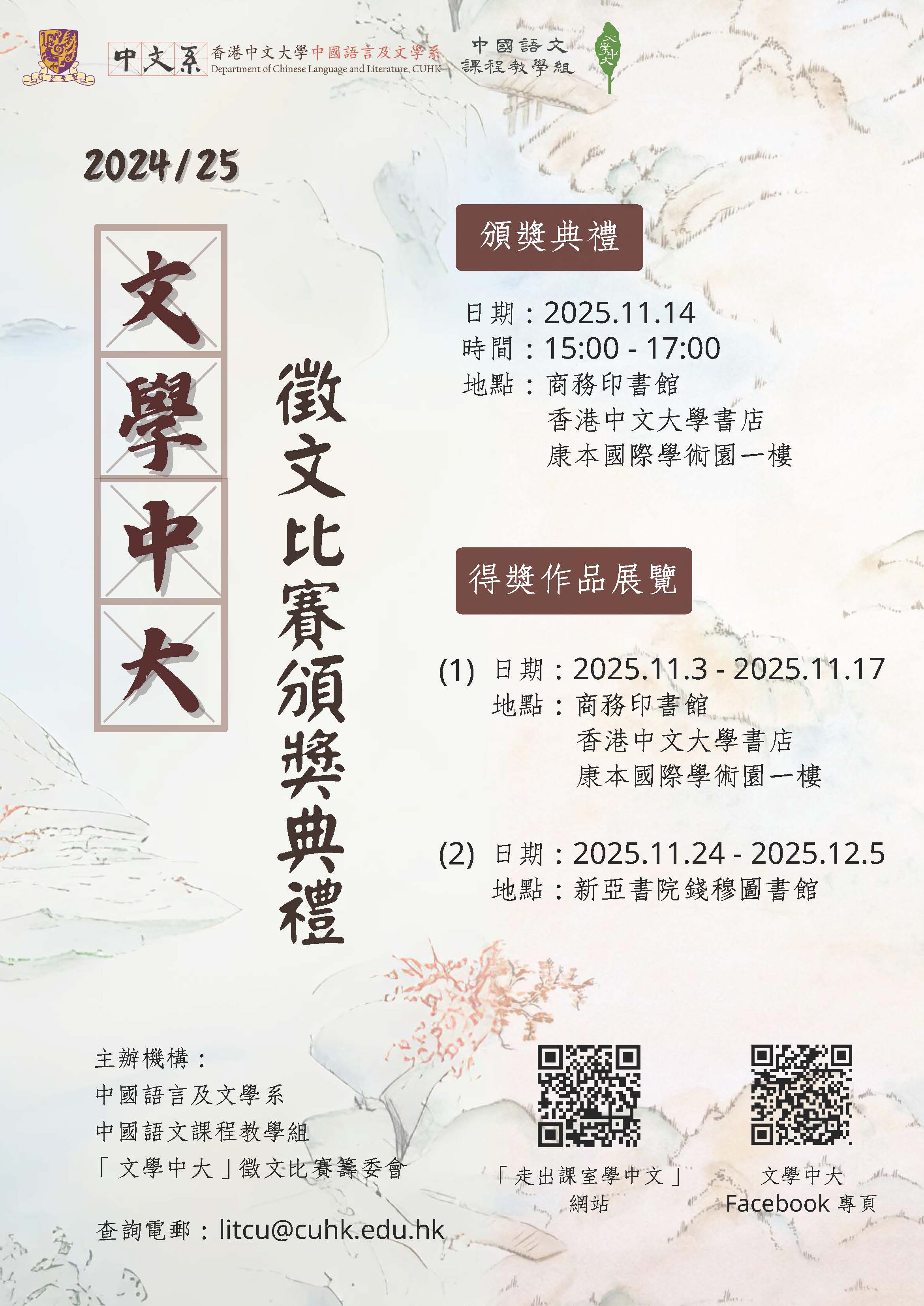 香港中文大學中國語言及文學系中國語文課程教學組舉辦第十屆「文學中大」徵文比賽,旨在提倡校園創作風氣,鼓勵同學描寫校園內外所見山水人文或社區面貌,並從中提煉所思所感,化思考為文字,把山城的人文關懷投向社會。香港中文大學本科生、研究生、教職員及校友均可參加。今屆比賽共有24位同學和校友獲得獎項,他們來自於不同學院、學系。文學並不專屬於某一個學院和學系,而是屬於每一位對中大校園有感受的人。同學走遍校園,以山水美景抒發個人體悟,訴說一個個山城人的故事。在筆墨中他們展現出中大人的人文精神,更有思辯文字,情理兼備。同學以創作描寫了中大的山水人文,亦以文學承載了個人的感悟。如欲了解更多展覽詳情,請瀏覽「走出課室學中文」網站: https://www.chltcac.cuhk.edu.hk/culitrecentnews 。