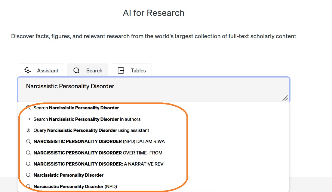 For example, I am interested in a particular topic, Narcissistic Personality Disorder. I can input the topic in the text box and click search. If an exact match is preferred, put double quotation marks, e.g. “Narcissistic Personality Disorder”. scite also suggests related topics for you to specify the search.